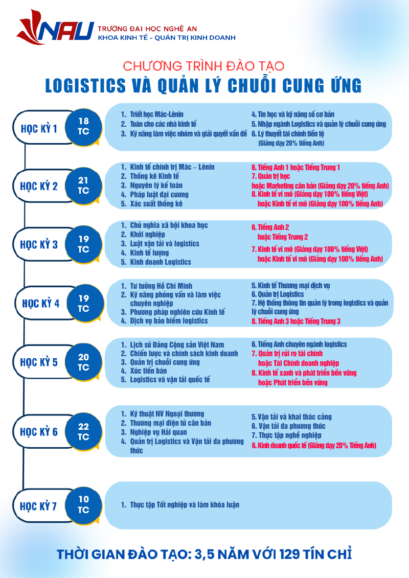 Chương trình đào tạo (CTĐT) ngành Logistics và Quản lý chuỗi cung ứng tại Trường Đại học Nghệ An được xây dựng theo định hướng ứng dụng, tuân thủ các quy định hiện hành của Bộ Giáo dục và Đào tạo. Với thời gian đào tạo chuẩn là 3,5 năm (tương đương 7 kỳ học) và tổng số 129 tín chỉ (chưa bao gồm các học phần Giáo dục thể chất và Giáo dục quốc phòng), chương trình này cung cấp một nền tảng kiến thức và kỹ năng toàn diện, cập nhật nhất về một trong những lĩnh vực phát triển nhanh nhất hiện nay.