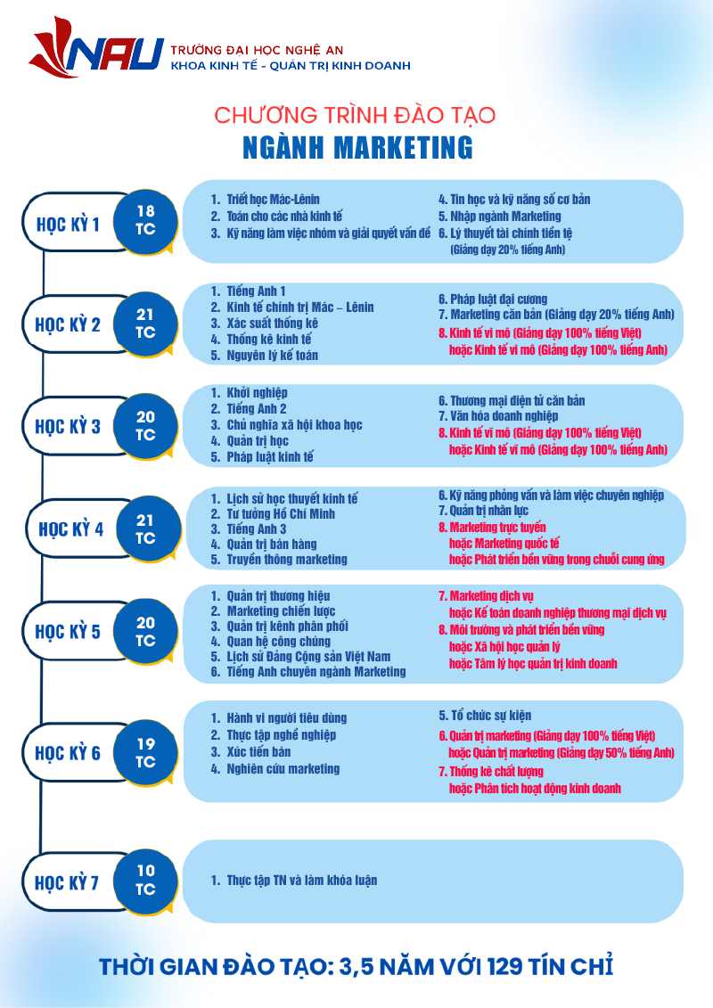 Chương trình đào tạo ngành Marketing (Mã ngành: 7340115) tại Trường Đại học Nghệ An được thiết kế theo định hướng ứng dụng, phù hợp với chuẩn đầu ra theo Khung trình độ quốc gia Việt Nam, đáp ứng yêu cầu đổi mới giáo dục đại học và xu thế hội nhập quốc tế trong lĩnh vực truyền thông – thương hiệu – tiêu dùng.