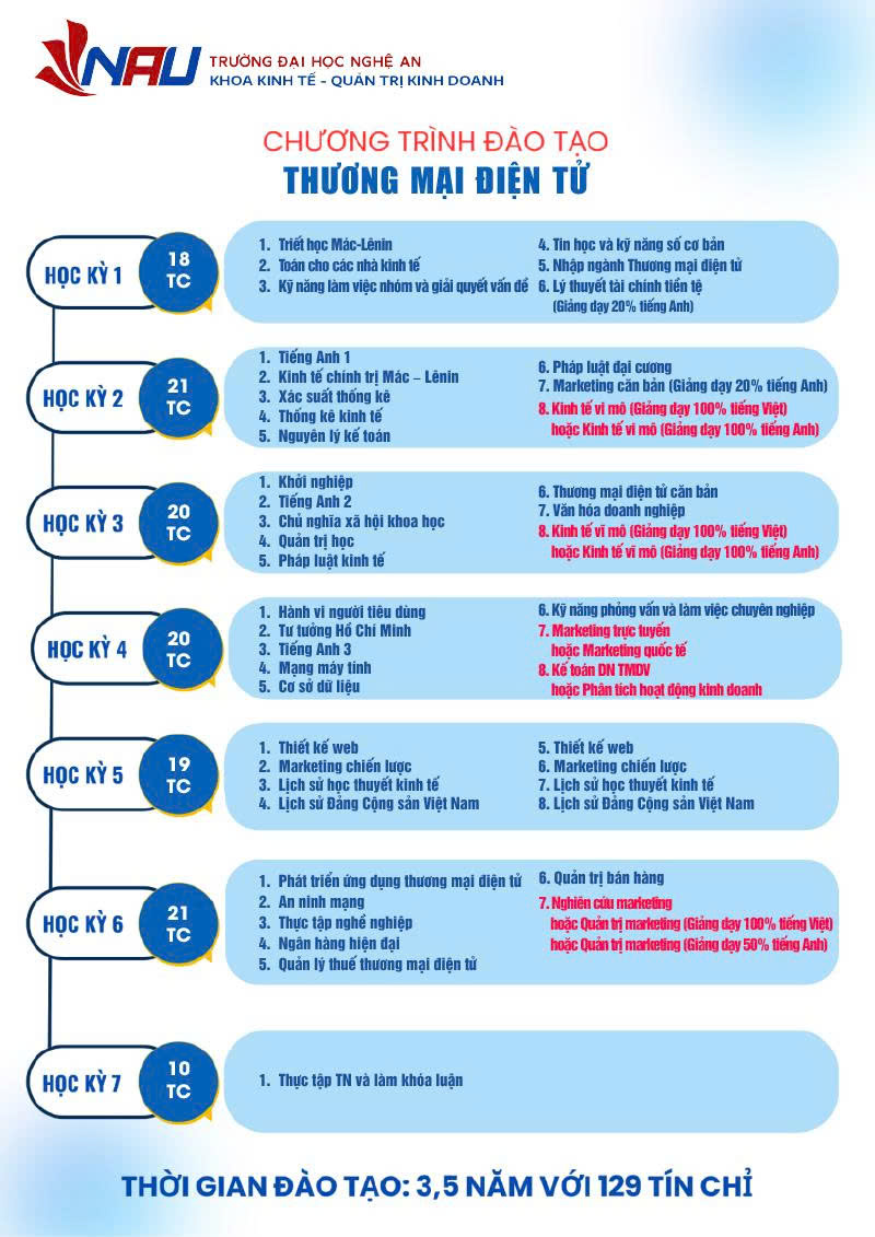 Trong bối cảnh thương mại toàn cầu phát triển mạnh mẽ và chuyển dịch số đang diễn ra ở quy mô toàn cầu, việc trang bị cho sinh viên nền tảng tiếng Anh chuyên ngành vững chắc là điều kiện thiết yếu. Nắm bắt được yêu cầu thực tiễn này, chương trình đào tạo ngành Thương mại điện tử tại Trường Đại học Nghệ An đã tích hợp nhiều học phần được giảng dạy một phần hoặc toàn phần bằng tiếng Anh. Đây là hướng đi chiến lược nhằm nâng cao năng lực cạnh tranh cho sinh viên trong môi trường lao động ngày càng quốc tế hóa.