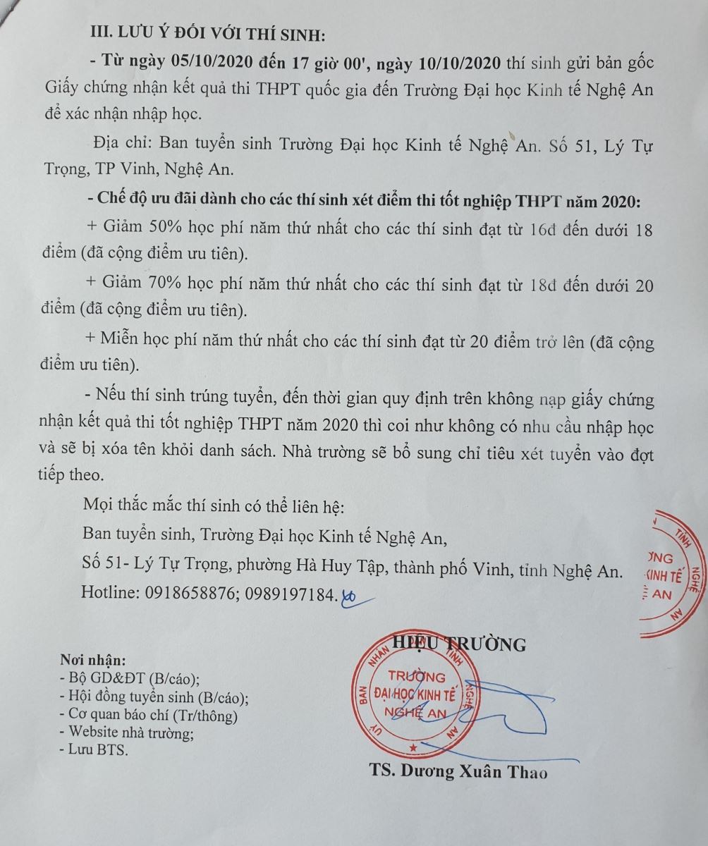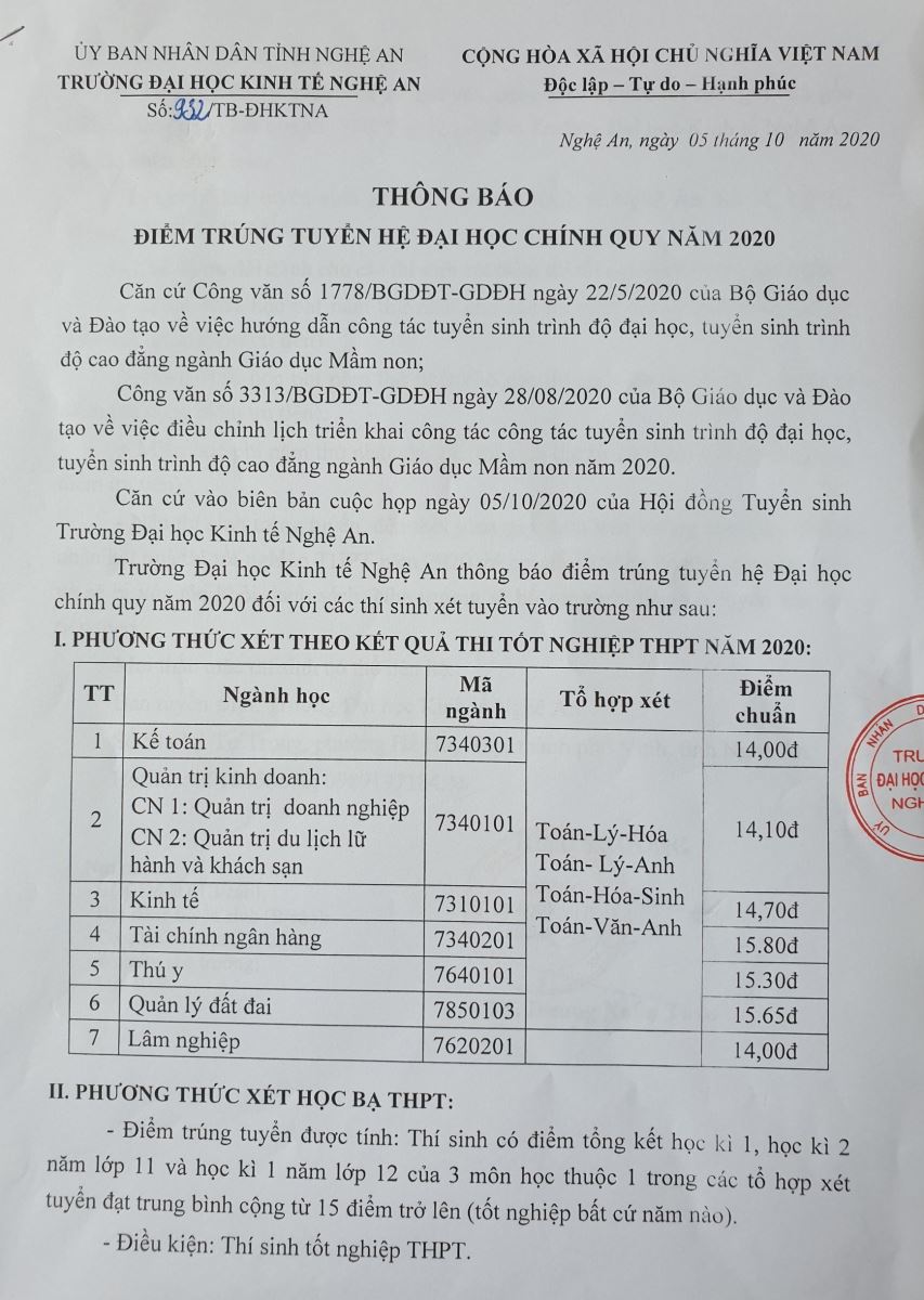 Trường Đại học Kinh tế Nghệ An thông báo điểm trúng tuyển hệ Đại học chính quy năm 2020 đối với các thí sinh xét tuyển vào trường như sau: