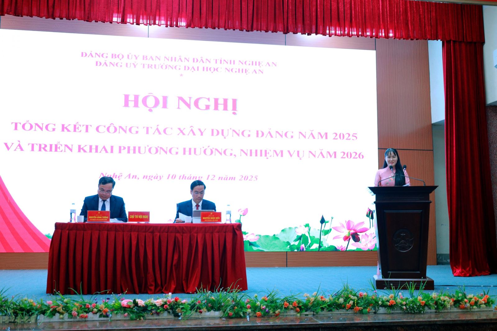 Chiều ngày 10/12, Đảng bộ Trường Đại học Nghệ An long trọng tổ chức Hội nghị tổng kết công tác xây dựng Đảng năm 2025 và triển khai phương hướng, nhiệm vụ năm 2026. Tham dự và chỉ đạo Hội nghị có đồng chí Nguyễn Trung Thành - Phó Trưởng ban Tổ chức Đảng ủy UBND Tỉnh; đồng chí Hà Thị Thu Hoài - Trưởng khoa giáo, Ban tuyên giáo và Dân vận Tỉnh ủy; cùng các đồng chí lãnh đạo, cán bộ, đảng viên của Đảng bộ Trường Đại học Nghệ An.