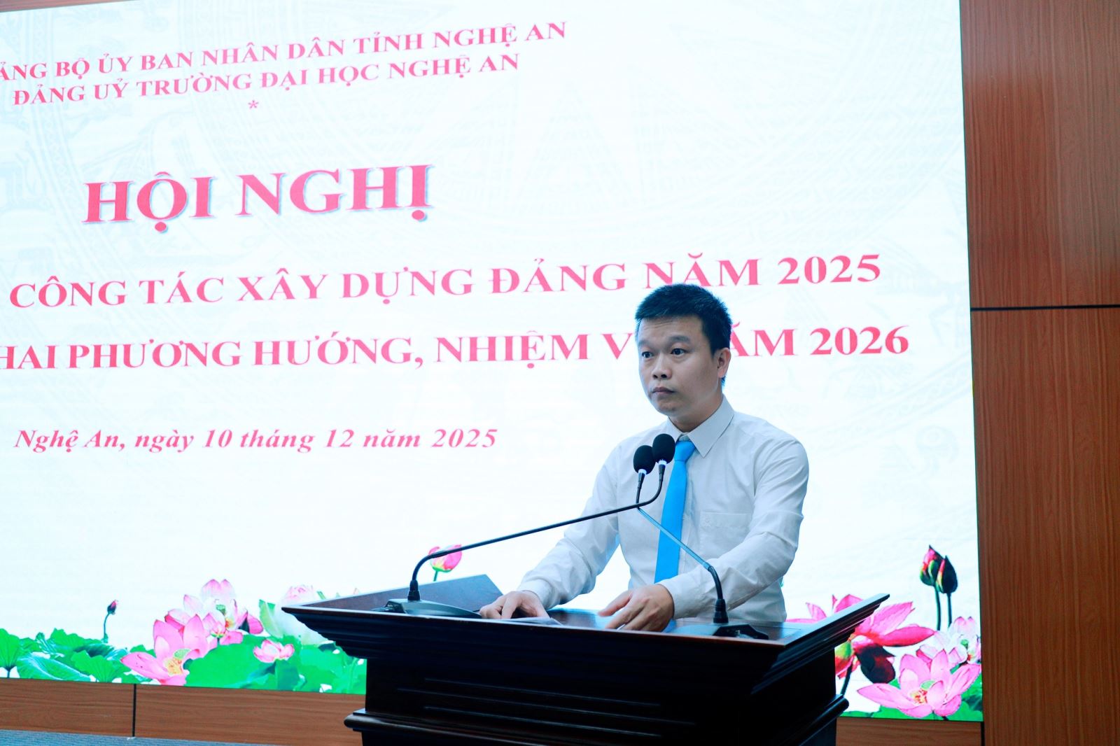 Phát biểu tại hội nghị, đồng chí Nguyễn Trung Thành - Phó Trưởng ban Tổ chức Đảng ủy UBND Tỉnh đã biểu dương và ghi nhận những thành tích của Đảng bộ Trường Đại học Nghệ An trong năm 2025. Đồng chí nhấn mạnh tầm quan trọng của công tác xây dựng Đảng đối với sự phát triển bền vững của Nhà trường – một cơ sở giáo dục đại học đa ngành, đa lĩnh vực, góp phần cung cấp nguồn nhân lực chất lượng cao cho tỉnh Nghệ An, hướng tới trở thành trung tâm đào tạo đổi mới sáng tạo, có uy tín trong nước và khu vực ASEAN.