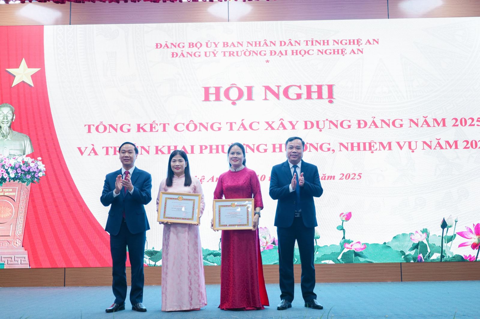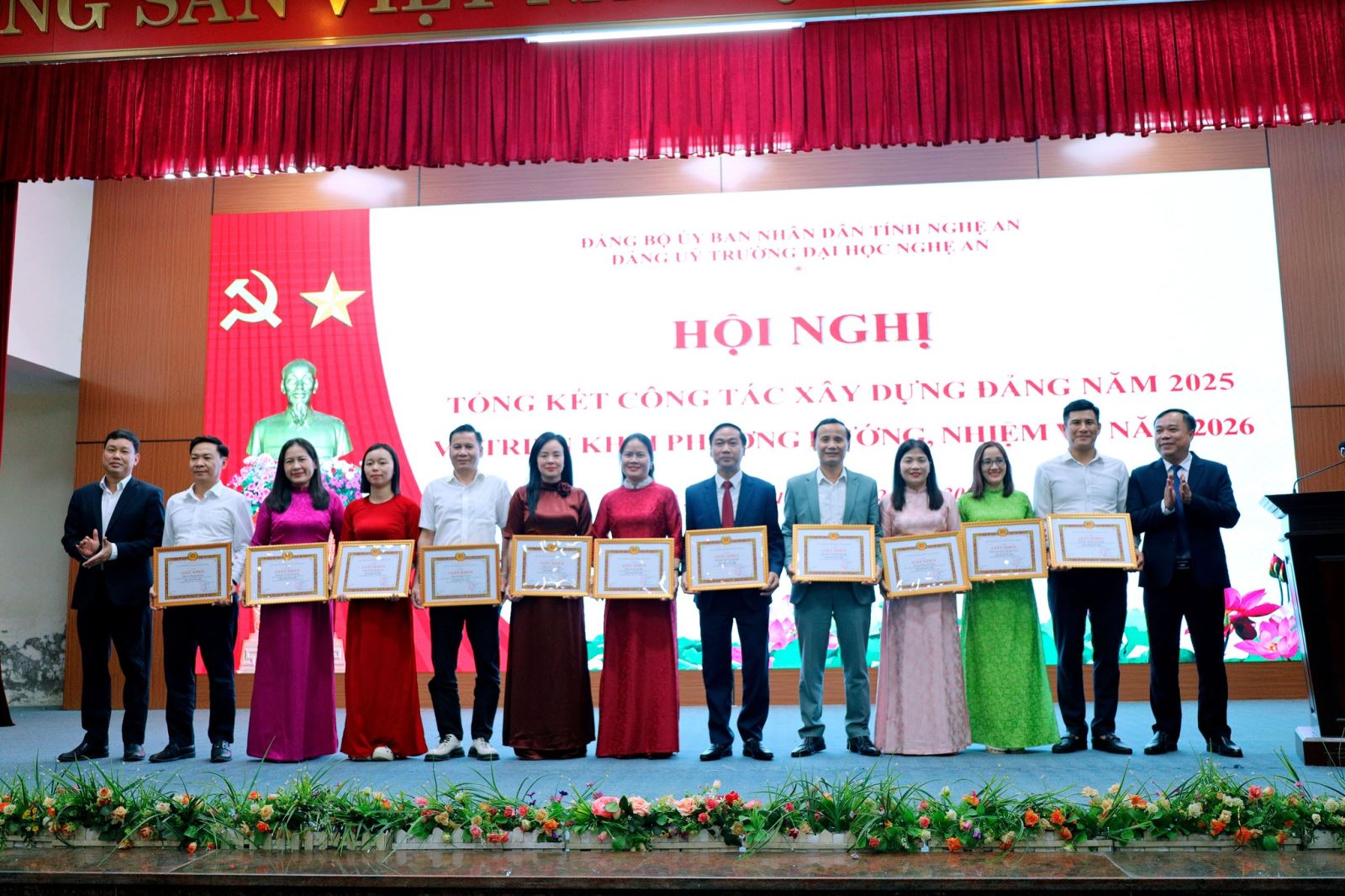 Dịp này, Tập thể chi bộ Khoa Kinh tế - QTKD được tặng Bằng khen của Ban Thường vụ Tỉnh uỷ đã có thành tích xuất sắc trong chỉ đạo, thực hiện Chỉ thị số 42-CT/TW, ngày 16/4/2010 của Bộ Chính trị về " tiếp tục đổi mới, nâng cao chất lượng hoạt động của Liên hiệp các Hội khoa học và Kỹ thuật Việt Nam trong thời kỳ đẩy mạnh công nghiệp hoá, hiện đại hoá đất nước". Đảng bộ Nhà trường cũng đã vinh danh và trao thưởng cho tập thể, cá nhân đạt tiêu chuẩn HTXSNV tiêu biểu trong năm 2025. Với những kết quả đạt được, toàn thể cán bộ, đảng viên của Đảng bộ Trường Đại học Nghệ An sẽ tiếp tục phát huy tinh thần đoàn kết, sáng tạo, quyết tâm hoàn thành xuất sắc các nhiệm vụ năm 2026.