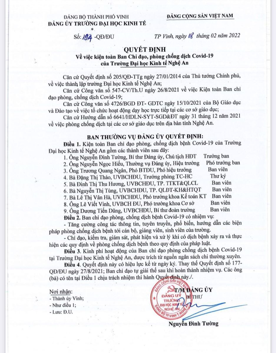 Quyết định về việc kiện toàn Ban Chỉ đạo, phòng chống dịch Covid-19 của Trường Đại học Kinh tế Nghệ An 10/02/2022 05:02 5060 lượt xem