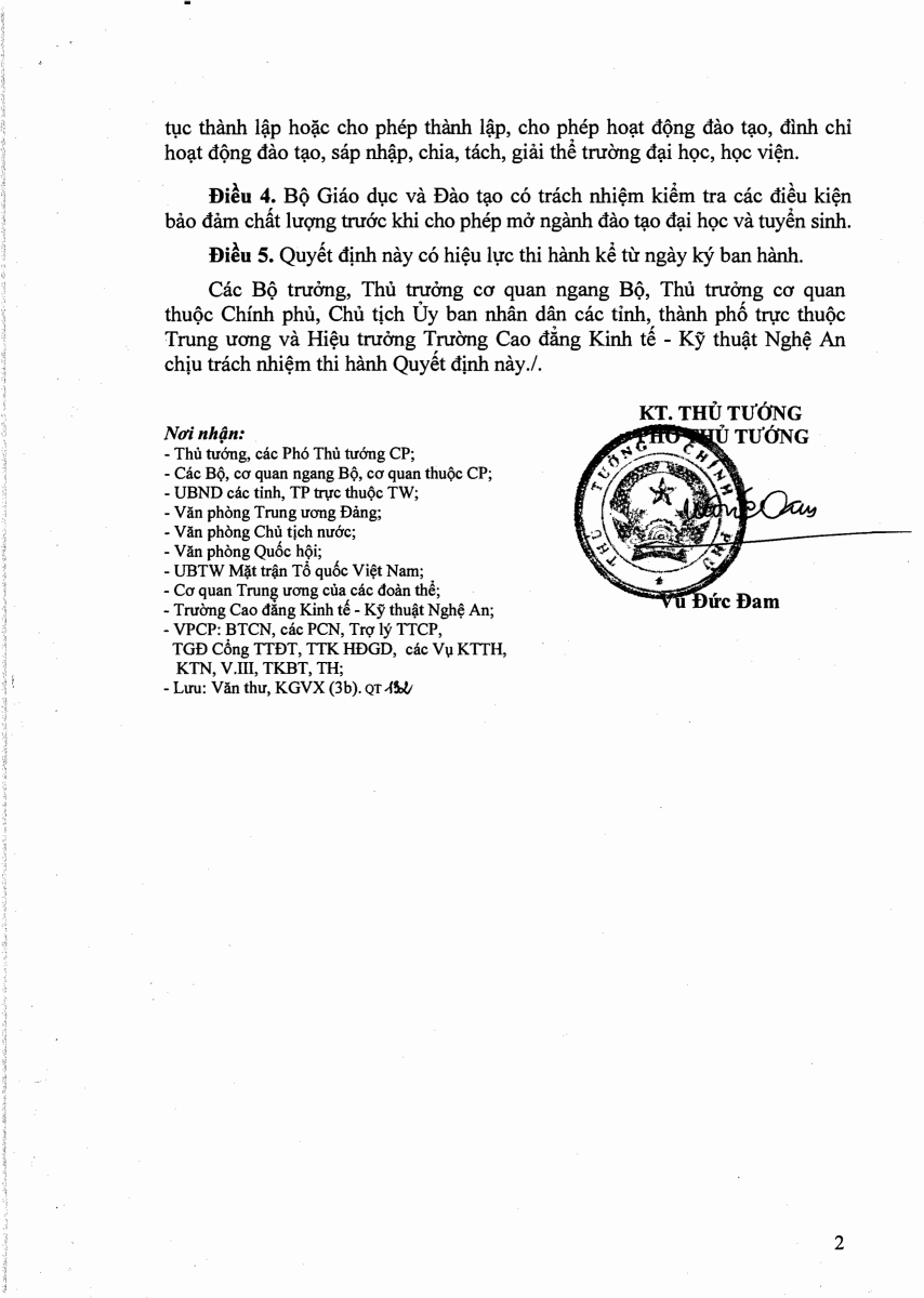 Các Bộ trưởng, Thủ trưởng cơ quan ngang Bộ, Thủ trưởng cơ quan thuộc Chính phủ, Chủ tịch Ủy ban nhân dân các tỉnh, thành phố trực thuộc Trung ương và Hiệu trưởng Trường Cao đẳng Kinh tế - Kỹ thuật Nghệ An chịu trách nhiệm thi hành Quyết định này./.