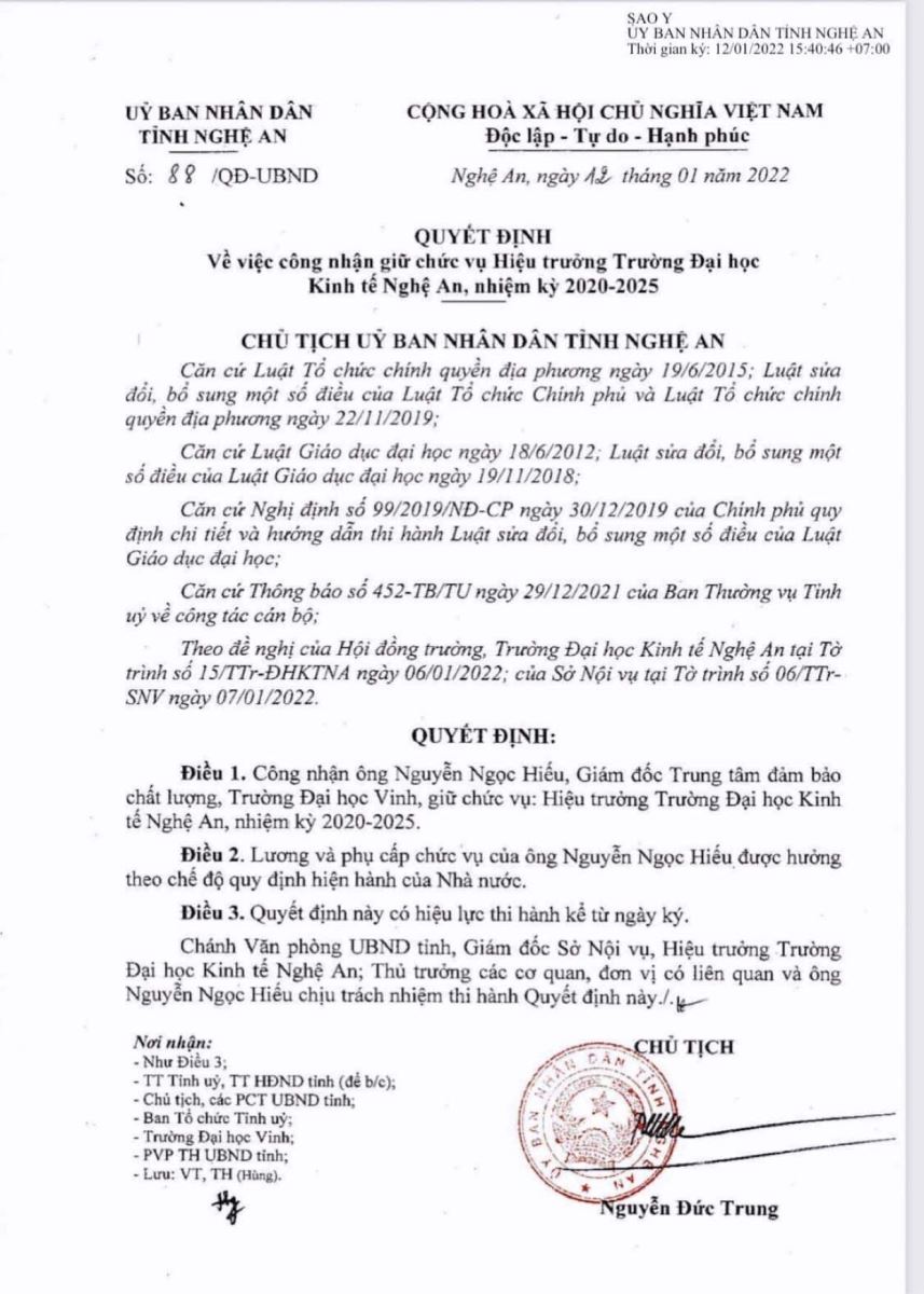 Quyết định về việc công nhận giữ chức vụ Hiệu trưởng Trường Đại học Kinh tế Nghệ An, nhiệm kỳ 2020-2025 14/01/2022 09:35 5018 lượt xem