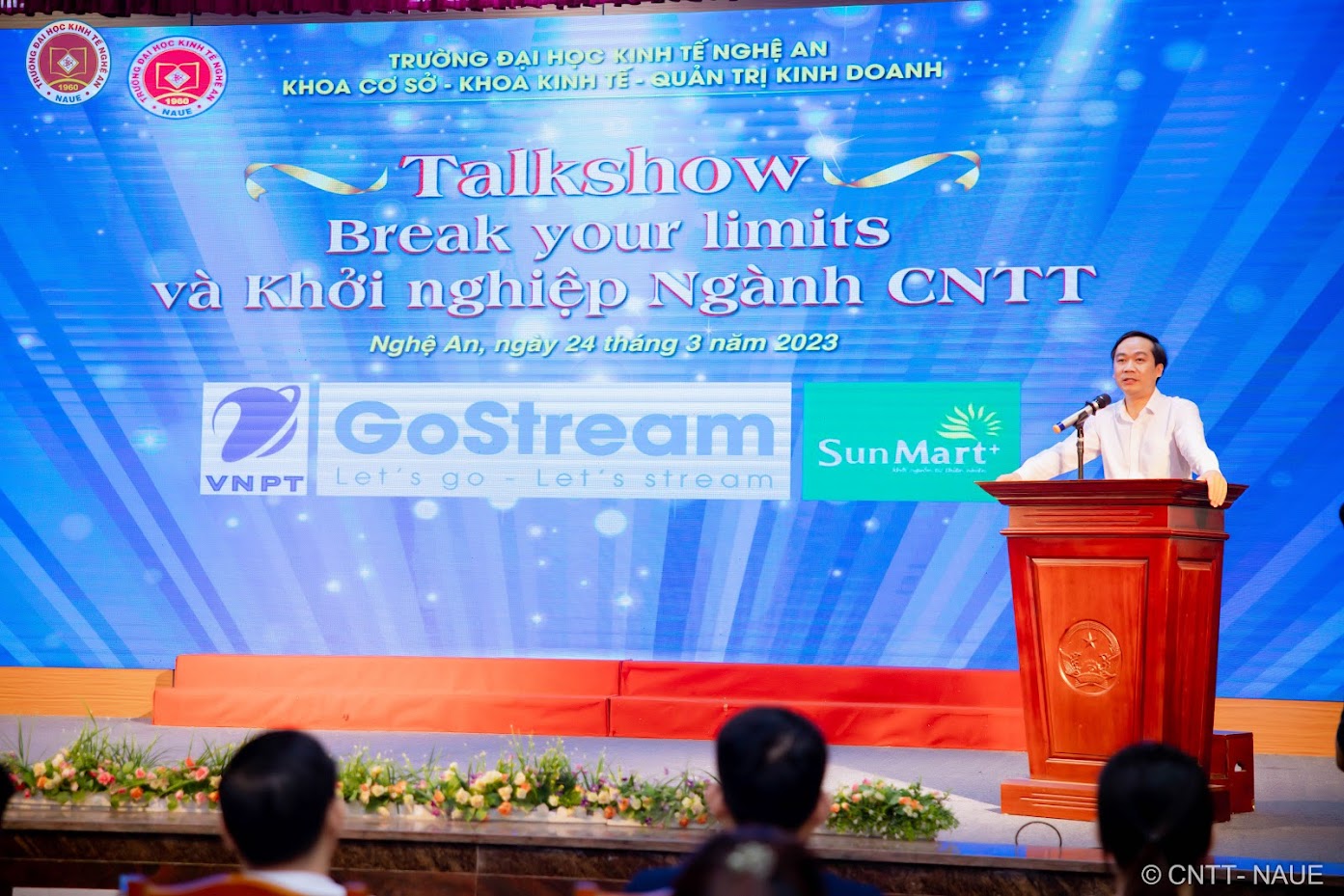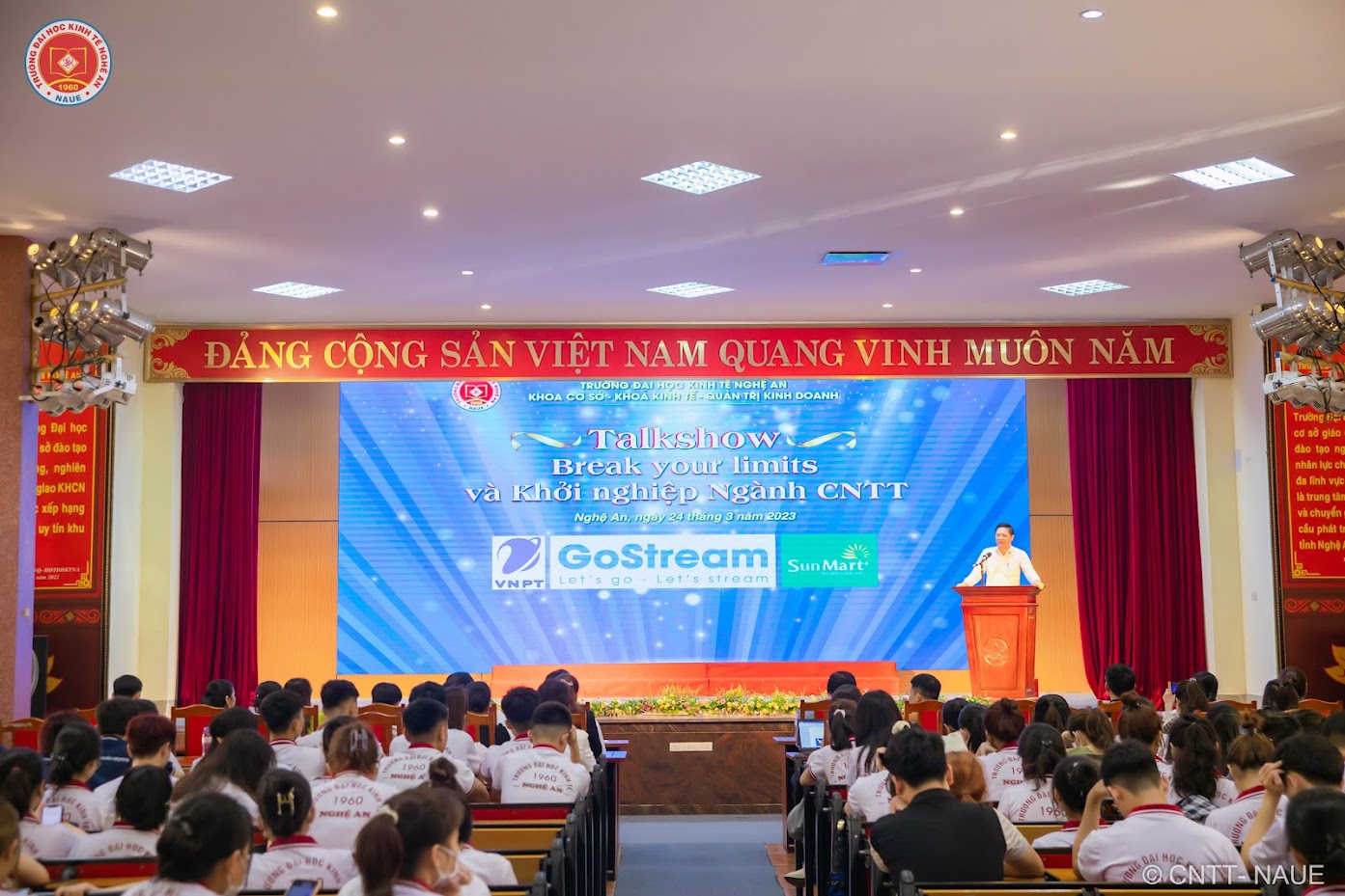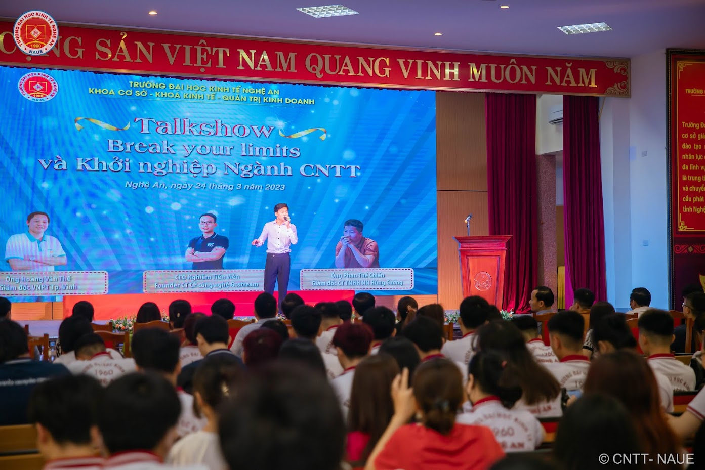 Sáng ngày 24/3/2023, Ngành Công nghệ thông tin - Trường Đại học Kinh tế Nghệ An đã tổ chức buổi Talkshow với chủ đề “Khởi nghiệp Ngành Công nghệ thông tin”, với sự trình bày của các diễn giả CEO Nghiêm Tiến Viễn - Người sáng lập công ty cổ phần công nghệ GoStream, Ông Hoàng Văn Thể - Giám đốc VNPT Thành phố Vinh, Ông Phan Thế Chiến – Giám đốc công ty TNHH Nông Nghiệp Hùng Cường.