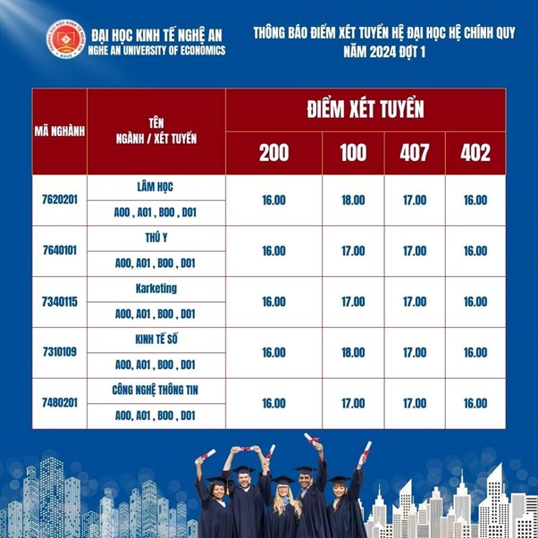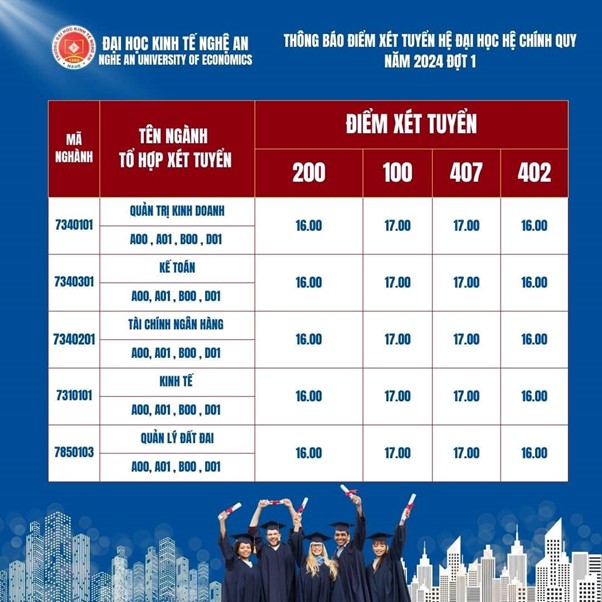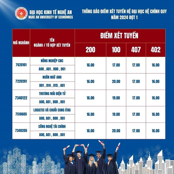 Hội đồng tuyển sinh Trường Đại học Kinh tế Nghệ An thông báo điểm xét tuyển hệ Đại học chính quy đợt 1 năm 2024 như sau:
