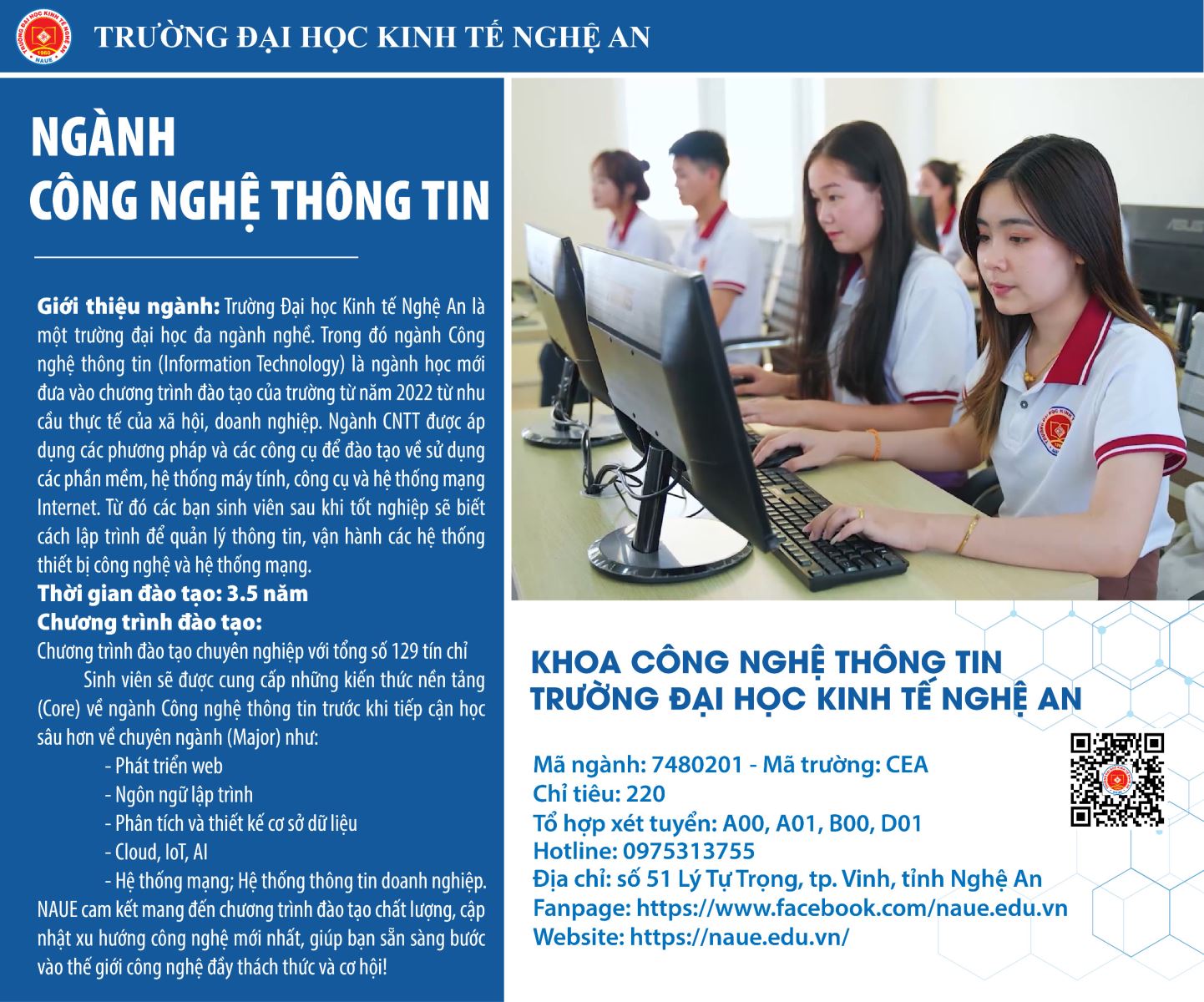 Kể từ năm học 2023 – 2024 ngành Công nghệ thông tin (Mã ngành: 7480201) được Trường Đại học Kinh tế Nghệ An đưa vào giảng dạy. Chương trình đào tạo được xây dựng để giúp sinh viên trang bị những kiến thức liên quan đến gia công hay ứng dụng hệ thống phần mềm, kiến thức về thiết kế, xây dựng, cài đặt, vận hành và bảo trì các thành phần phần cứng, phần mềm của hệ thống máy tính và các hệ thống thiết bị dựa trên máy tính; kiến thức về mạng máy tính và truyền thông.