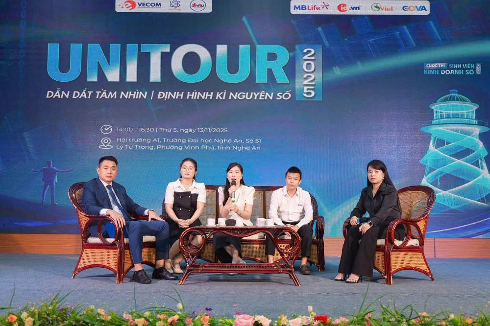 Giải mã vai trò của AI trong kinh doanh số và cách sinh viên có thể tận dụng AI như “trợ thủ chiến lược”. Sau các bài chia sẻ, chương trình tiếp tục với phiên tọa đàm “Kinh doanh số và cơ hội nghề nghiệp trong TMĐT - CNTT”, nơi sinh viên được trực tiếp trao đổi và đặt câu hỏi cho các chuyên gia. Không khí sự kiện càng trở nên sôi động với minigame quay số may mắn, mang đến nhiều phần quà hấp dẫn dành cho các bạn tham dự. Unitour 2025 đã mang đến cho sinh viên viên NAU: Góc nhìn cập nhật về xu hướng TMĐT & Kinh tế số. Kiến thức thực tiễn về xây dựng thương hiệu cá nhân & kỹ năng số. Cơ hội giao lưu trực tiếp cùng các chuyên gia đầu ngành. Động lực để sinh viên tự tin định hướng nghề nghiệp trong kỷ nguyên AI. Chương trình không chỉ lan tỏa tri thức mà còn khơi dậy tinh thần chủ động học hỏi, đổi mới và sáng tạo của sinh viên Trường Đại học Nghệ An – những chủ nhân của nền kinh tế số tương lai.