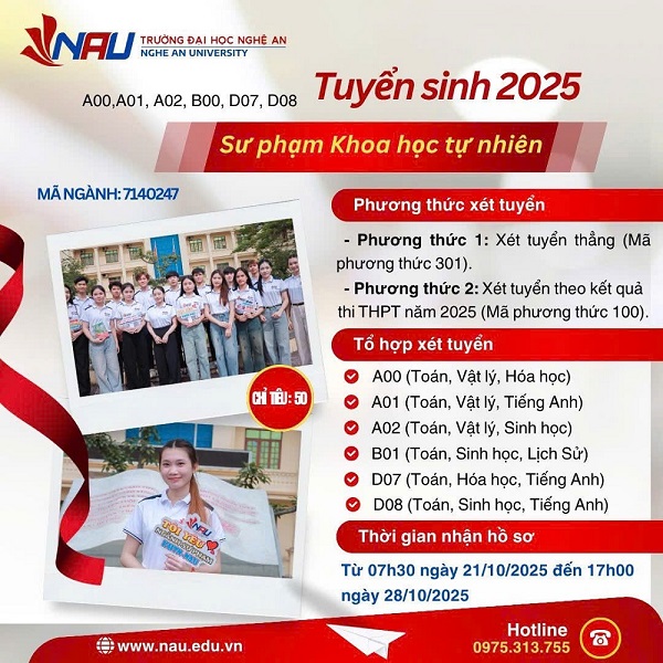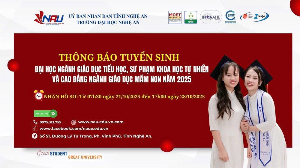 👩🏫 Trường Đại học Nghệ An thông báo tuyển sinh đại học các ngành Sư phạm Khoa học tự nhiên, Giáo dục Tiểu học và Cao đẳng Giáo dục Mầm non năm 2025