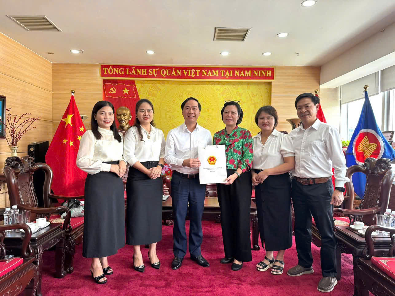 Trong khuôn khổ chuyến công tác tại Trung Quốc, đoàn công tác đã có buổi gặp gỡ và làm việc với bà Nguyễn Thị Hương - Tổng lãnh sự, cùng cán bộ lãnh sự quán Việt Nam tại thành phố Nam Ninh (Trung Quốc). Buổi làm việc diễn ra trong không khí cởi mở, thân thiện, thể hiện sự quan tâm và đồng hành của cơ quan đại diện ngoại giao Việt Nam tại Trung Quốc với hoạt động hợp tác quốc tế của các cơ sở giáo dục đại học trong nước.