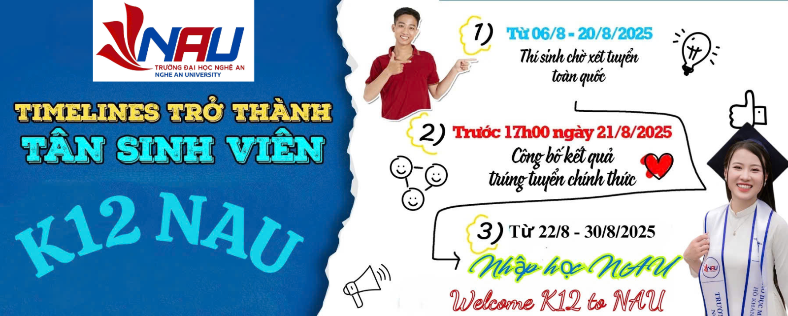 Đã đến lúc bứt phá, bắt đầu một hành trình mới mang tên: Tân sinh viên K12 Đại học Nghệ An! Một chặng đường mới đang mở ra trước mắt bạn – đầy hứa hẹn, thú vị và cũng không thiếu thử thách. Để không bị “lạc trôi” trong biển thông tin, cùng mình check ngay timeline siêu quan trọng này nha!