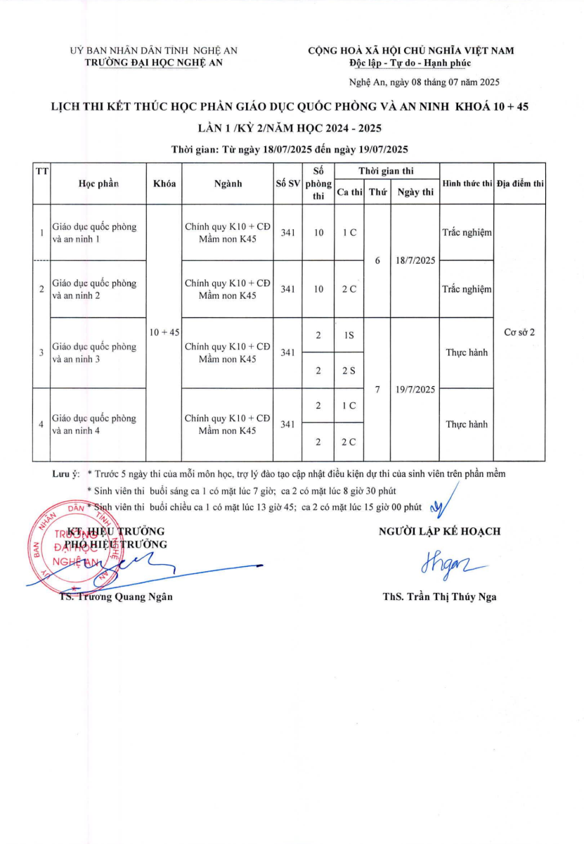 Lịch thi kết thúc học phần Giáo dục quốc phòng và An ninh khóa 10 + 45 - Lần 1 - Kỳ 2 năm học 2024 - 2025 08/07/2025 10:41 700 lượt xem