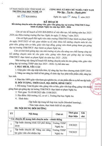 Kê hoạch bồi dưỡng chuyên môn cho Giảng viên, giáo viên tại trường TH&THCS THSP Nghệ An năm học 2025-2026 20/08/2025 09:26 447 lượt xem