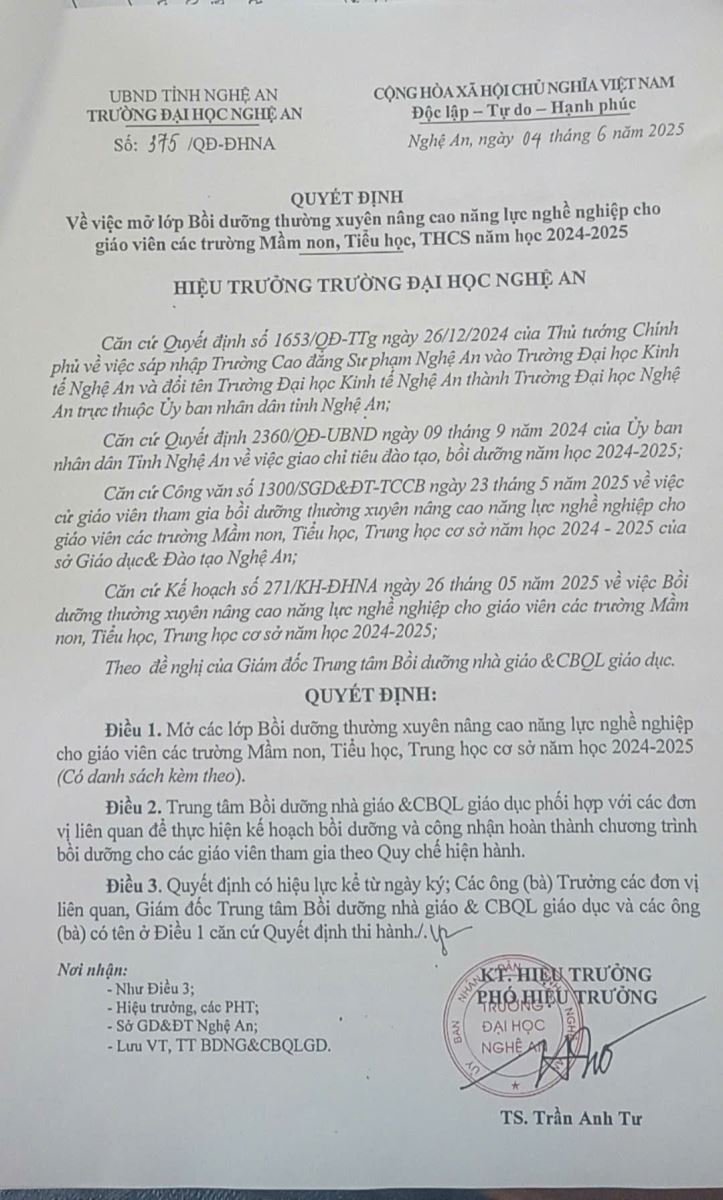 Quyết định V/v mở lớp Bồi dưỡng thường xuyên nâng cao năng lực nghề nghiệp cho gv trường MN 04/06/2025 10:31 1146 lượt xem