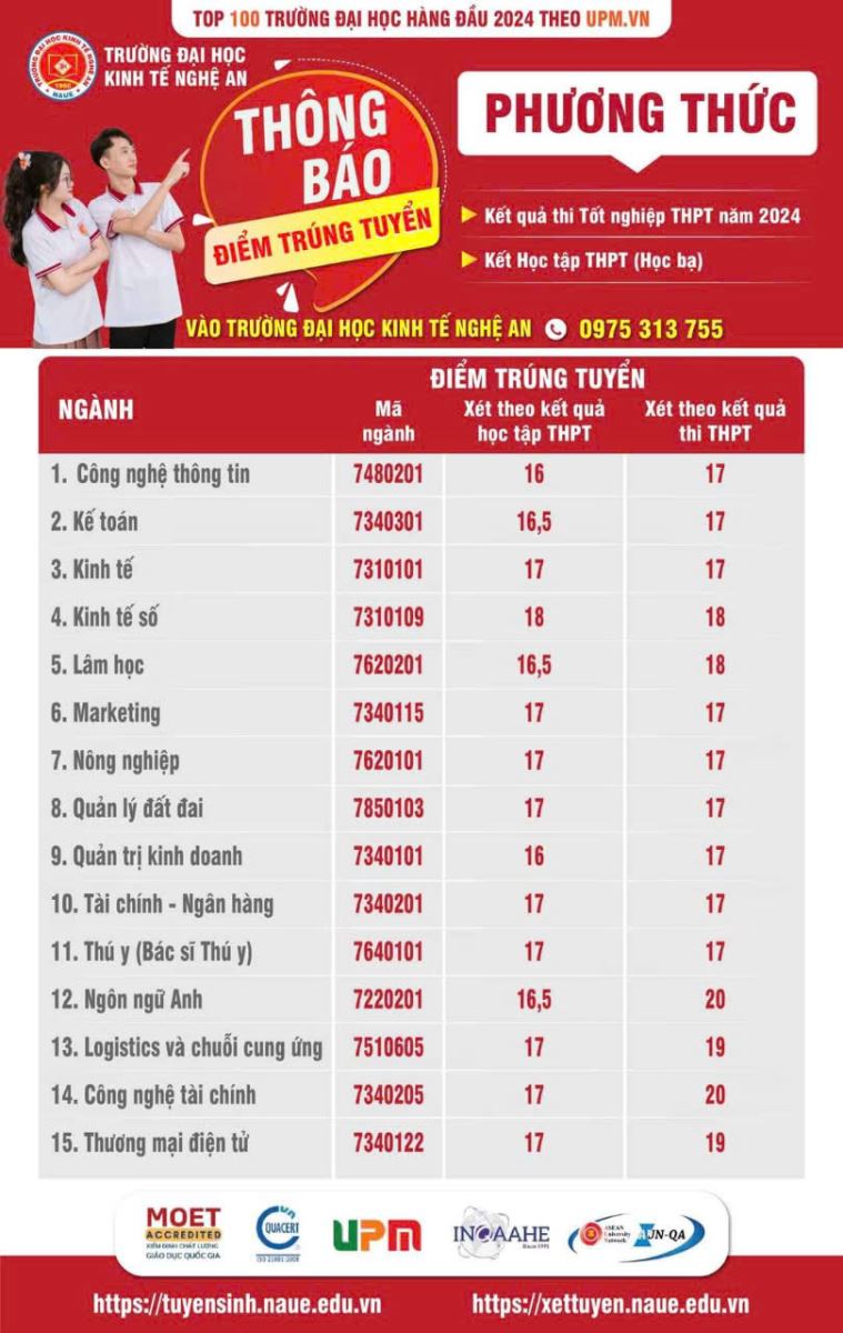 Năm 2024 điểm chuẩn tuyển sinh theo phương thức xét điểm thi THPT (phương thức 100) ngành Quản lý đất đai của Trường Đại học Kinh tế Nghệ An là (17 điểm). Liên tục nằm ở nhóm cao so với các trường cùng đào tạo ngành này như: Học Viện Nông nghiệp Việt Nam (16,5 Điểm), Trường Đại học Nông Lâm Huế (15 Điểm), Trường Đại học Tài nguyên và Môi trường Hà Nội (15 Điểm), đối với khu vực Nghệ An còn cao hơn Trường Đại học Vinh (16 điểm). Nguyên nhân xuất phát từ: