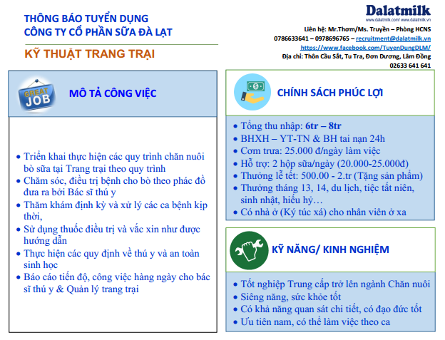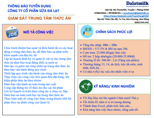 Thông báo tuyển dụng của Công ty cổ phần sữa Đà Lạt 26/05/2021 05:52 7189 lượt xem Công ty cổ phần sữa Đà Lạt cần tuyển dụng các vị trí sau: