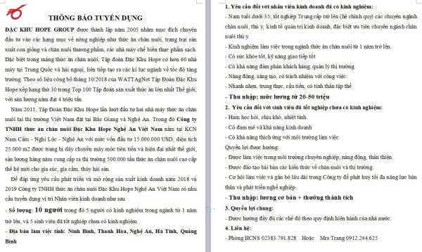 Thông báo tuyển dụng của công ty TNHH thức ăn chăn nuôi Đặc khu Hope Nghệ An 02/12/2018 10:57 7565 lượt xem