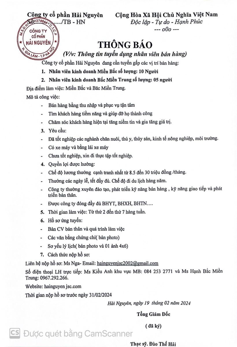 Thông báo tuyển dụng nhân viên bán hàng của công ty cổ phần Hải Nguyên 19/02/2024 09:48 4311 lượt xem