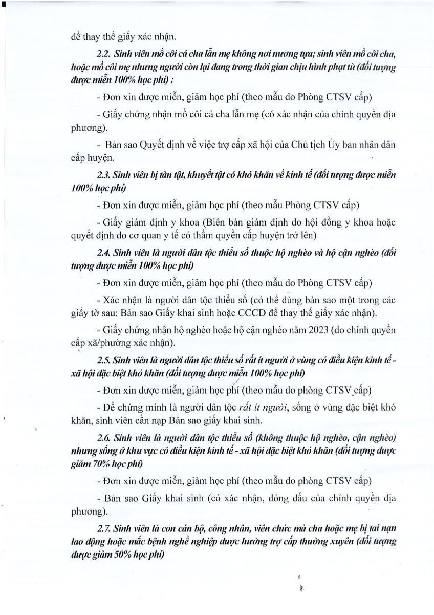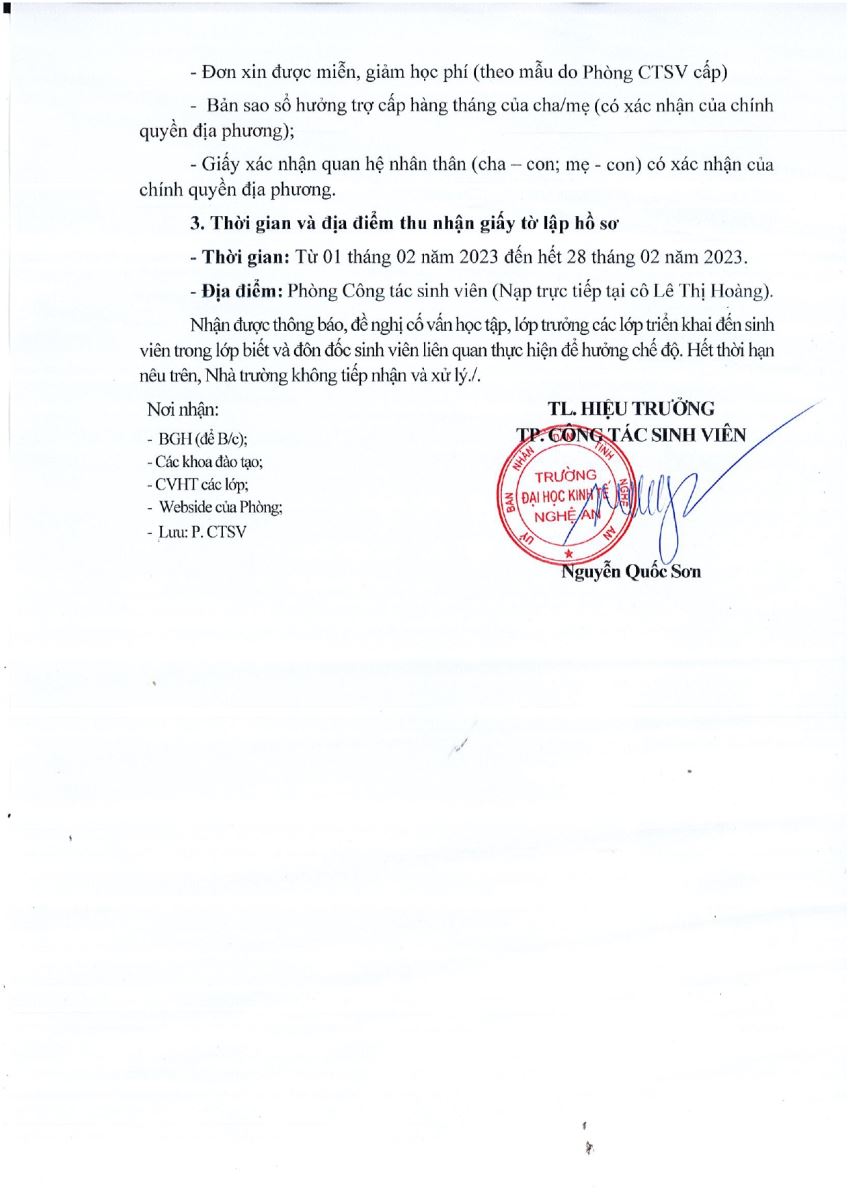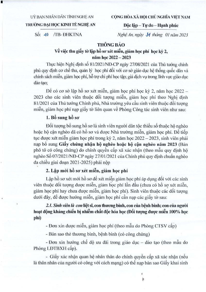 Thông báo về việc thu giấy tờ xét miễn, giảm học phí học kỳ 2 năm học 2022-2023 08/02/2023 09:47 5899 lượt xem Để thực hiện chế độ miễn, giảm học phí cho sinh viên đúng đối tượng được hưởng trong học kỳ II năm học 2022-2023, Nhà trường thông báo các sinh viên thuộc đối tượng được miễn giảm học phí nạp giấy tờ có liên quan về Phòng Công tác sinh viên như sau: