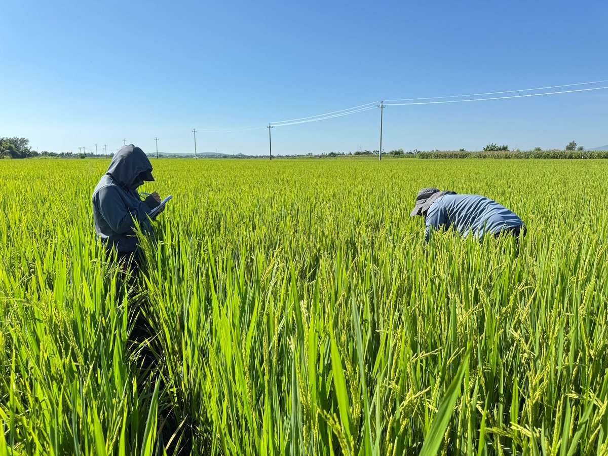 Cán bộ Trung tâm Trồng trọt và Bảo vệ thực vật miền Trung điều tra tình hình sâu bệnh trên ruộng lúa áp dụng mô hình IPHM.