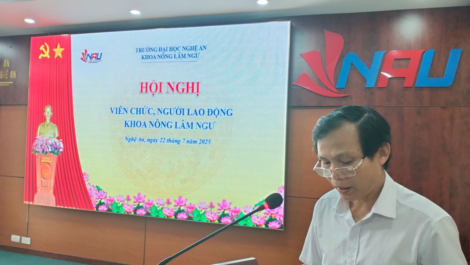 Chiều ngày 22 tháng 7 năm 2025, Khoa Nông – Lâm – Ngư, Trường Đại học Nghệ An đã long trọng tổ chức Hội nghị Viên chức, Người lao động năm học 2024–2025. Hội nghị nhằm tổng kết, đánh giá kết quả thực hiện nhiệm vụ năm học 2024–2025, đề ra phương hướng, nhiệm vụ năm học mới và phát huy tinh thần dân chủ, đoàn kết trong toàn thể cán bộ, giảng viên, người lao động.