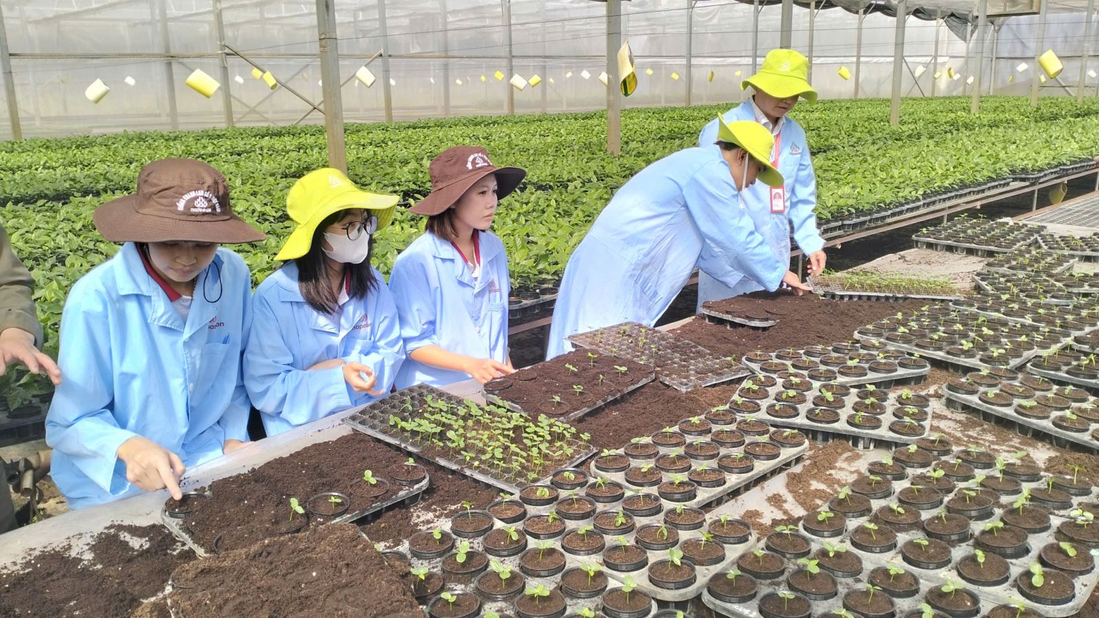 Sau chương trình làm việc tại nhà máy, đoàn tiếp tục tham quan các khu vực sản xuất giống và vùng trồng nguyên liệu của Nafoods. Sinh viên được tìm hiểu quy trình gieo hạt tạo cây gốc ghép, thăm nhà chăm sóc cây con, nhà trồng và chăm sóc cây đầu dòng – những khâu nền tảng quyết định chất lượng giống. Đặc biệt, đoàn được quan sát trực tiếp quy trình nhân giống bằng phương pháp ghép, kỹ thuật chăm sóc cây sau ghép và quy trình đóng thùng cây con để vận chuyển đến vùng sản xuất. Đây là những bước kỹ thuật quan trọng, đòi hỏi trình độ chuyên môn cao và là nội dung cốt lõi trong đào tạo ngành Nông nghiệp công nghệ cao.