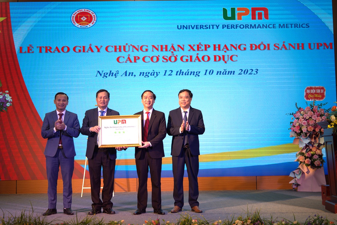 Sáng ngày 12/10/2023, hệ thống xếp hạng đối sánh chất lượng ĐH Việt Nam và khu vực UPM, đã trao giấy chứng nhận đạt chuẩn 3 sao plus cho Trường Đại học Kinh tế Nghệ An.