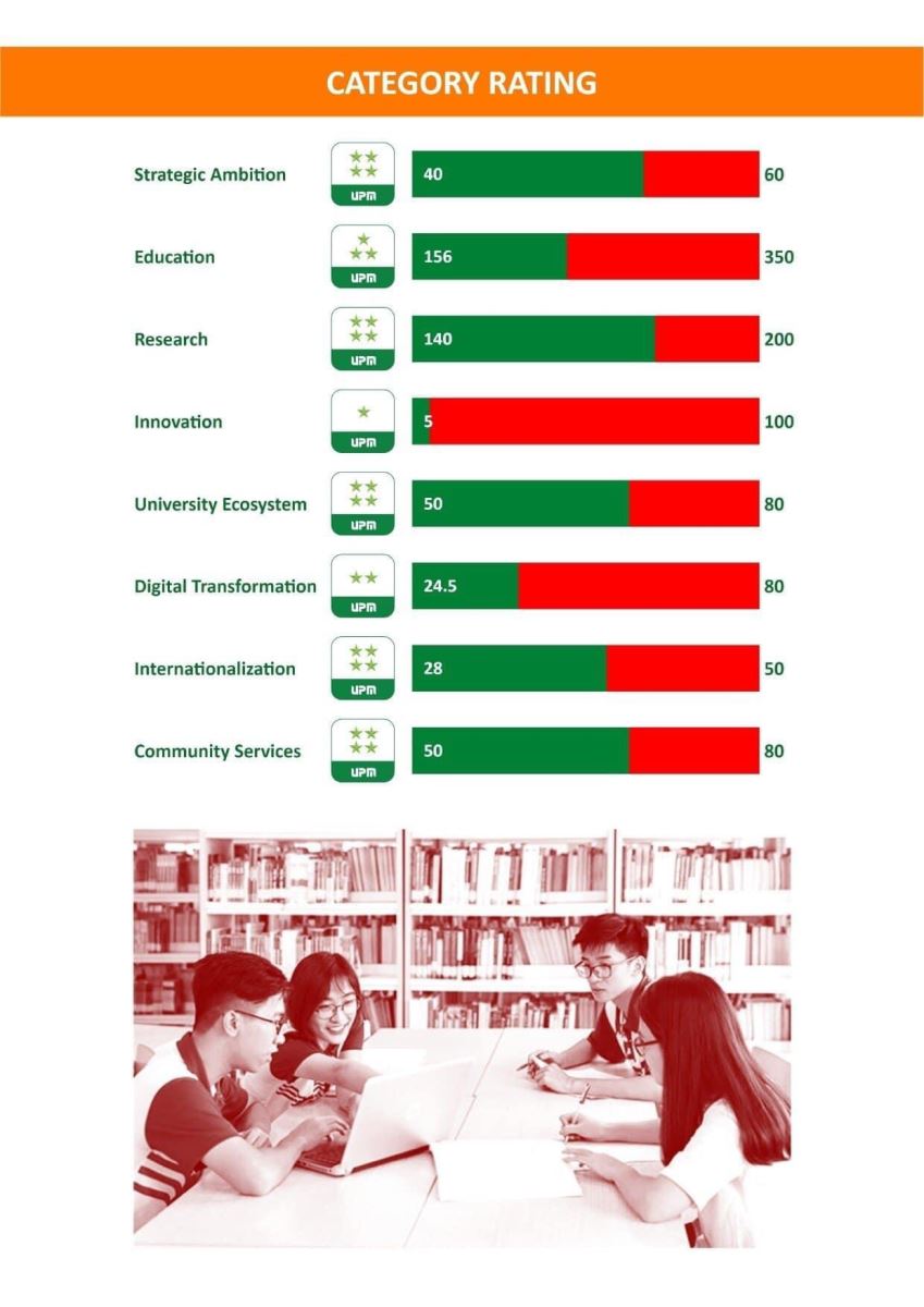UPM gồm 8 nhóm lĩnh vực và 54 tiêu chí. Mỗi lĩnh vực có mốc chuẩn và trọng số riêng với tổng cộng là 1000 điểm. 8 nhóm lĩnh vực lần lượt là: Quản trị chiến lược (5 tiêu chí, trọng số 6%), Đào tạo (15 tiêu chí, trọng số 35%), Nghiên cứu (4 tiêu chí, trọng số 20%), Đổi mới sáng tạo (4 tiêu chí, trọng số 11%), Hệ sinh thái đổi mới sáng tạo (4 tiêu chí, trọng số 6%), CNTT và tài nguyên số (10 tiêu chí, trọng số 10%), Mức độ quốc tế hóa (9 tiêu chí, trọng số 6%) và Phục vụ cộng đồng (3 tiêu chí, trọng số 6%).