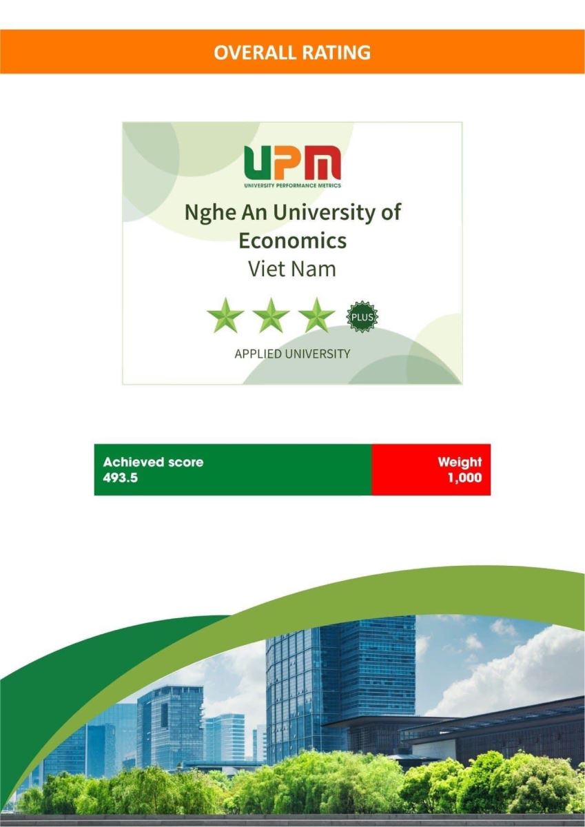 Theo đó, Trường Đại học Kinh tế Nghệ An đã đạt được kết quả tổng thể ở mức 3 sao PLUS theo định hướng ứng dụng. Trong đó, 5/8 lĩnh vực: Định hướng chiến lược; Nghiên cứu khoa học; Khuôn viên đại học; Quốc tế hóa và Phục vụ cộng đồng cùng đạt 4 sao.