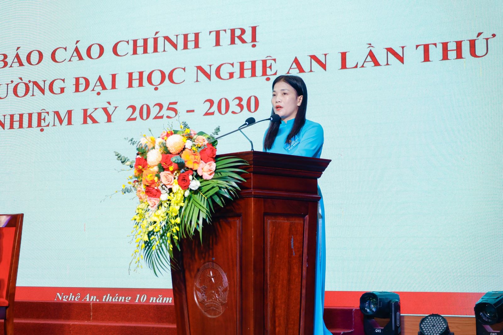 TS. Đặng Thị Thảo - Chủ tịch Công đoàn Trường trình bày dự thảo Báo cáo chính trị Đại hội Công đoàn Trường Đại học Nghệ An lần thứ I, nhiệm kỳ 2025 - 2030