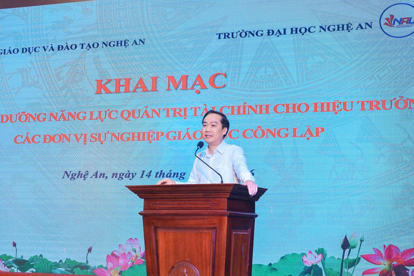 Phát biểu khai mạc khóa bồi dưỡng, NGƯT.TS. Nguyễn Văn Khoa – Giám đốc Sở GD&ĐT Nghệ An nhấn mạnh vai trò then chốt của công tác quản trị tài chính trong bối cảnh đổi mới căn bản, toàn diện giáo dục. Đồng chí khẳng định việc nâng cao năng lực quản trị tài chính cho đội ngũ hiệu trưởng sẽ góp phần sử dụng hiệu quả nguồn lực, tăng cường tính tự chủ, minh bạch và trách nhiệm giải trình trong các cơ sở giáo dục; đồng thời kỳ vọng các học viên sẽ nghiêm túc học tập, vận dụng hiệu quả vào thực tiễn quản lý tại đơn vị.
