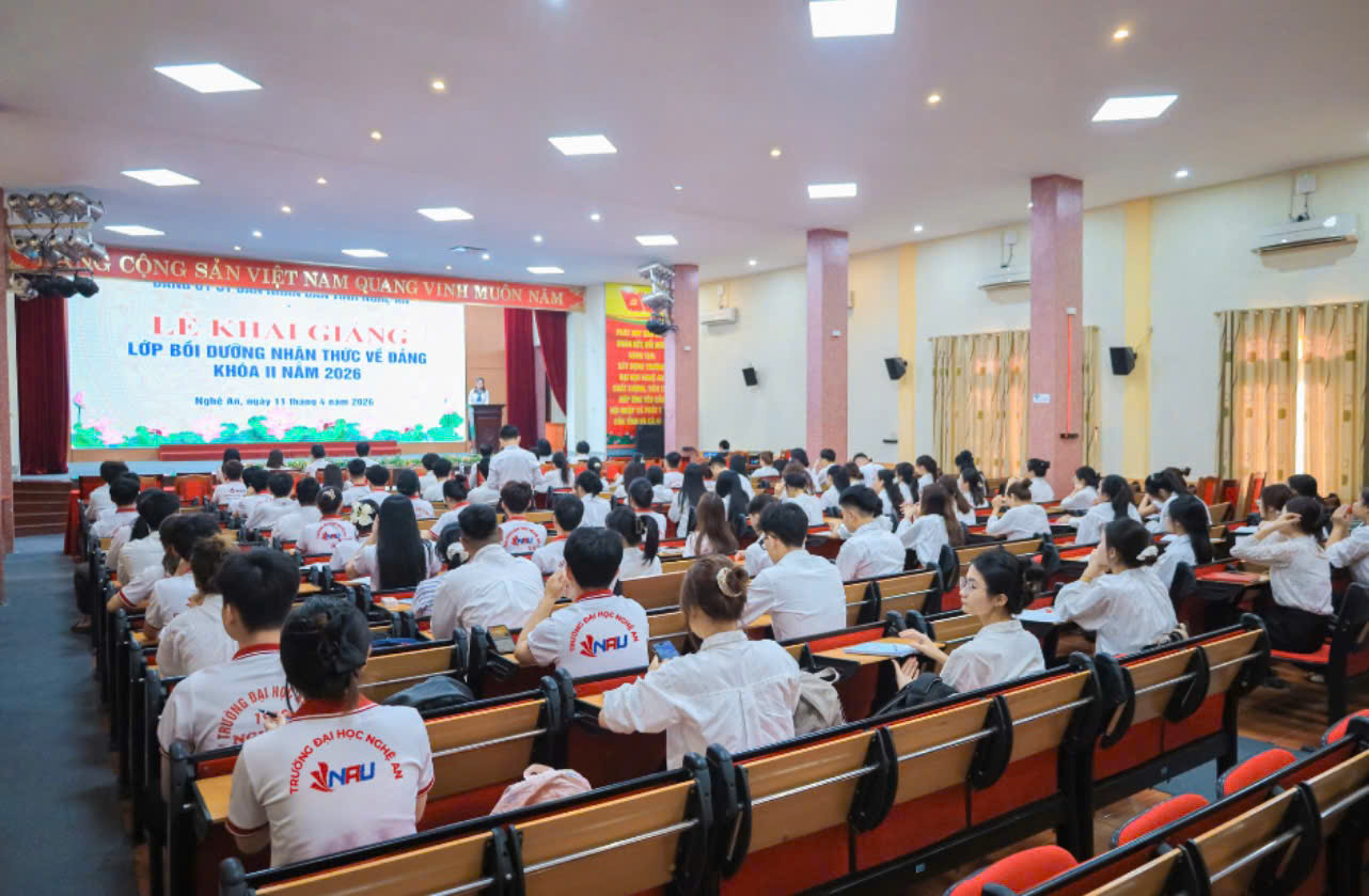 Thực hiện nhiệm vụ trọng tâm trong công tác xây dựng Đảng năm 2026, sáng ngày 11/4/2026, tại Trường Đại học Nghệ An, Đảng ủy Ủy ban nhân dân tỉnh đã tổ chức khai giảng Lớp Bồi dưỡng nhận thức về Đảng khóa II dành cho 93 sinh viên ưu tú của Nhà trường. Sự kiện có ý nghĩa quan trọng trong việc nâng cao chất lượng giáo dục chính trị tư tưởng, tạo nguồn phát triển đảng viên ngay trong môi trường đại học.
