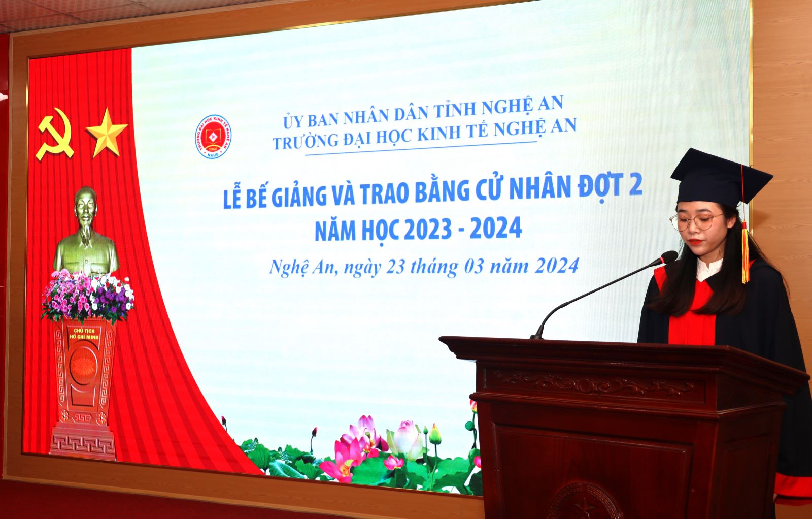 Hơn 200 tân Cử nhân đã chính thức nói lời chia tay với mái Trường Đại học Kinh tế Nghệ An. Dẫu vậy, hình ảnh về một Lễ tốt nghiệp trang trọng; lời dặn dò chân tình của lãnh đạo nhà trường; chia sẻ sâu sắc của những người thành công; sự chăm lo chu đáo của các cán bộ, giảng viên, nhân viên nhà trường đã mang đến nụ cười và những giọt nước mắt hạnh phúc cho các tân khoa trong buổi lễ nhận bằng tốt nghiệp.