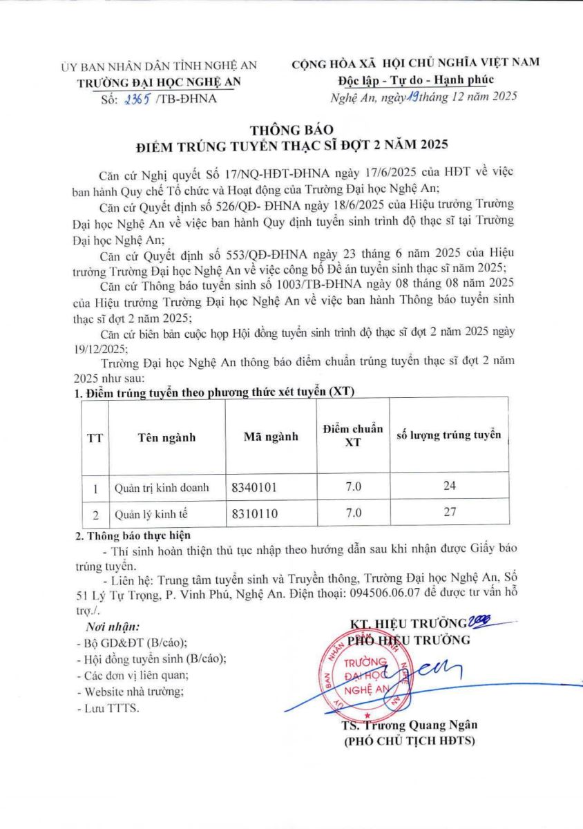 Thông báo điểm trúng tuyển Thạc sĩ đợt 2 năm 2025 19/12/2025 10:16 166 lượt xem Trường Đại học Nghệ An thông báo điểm trúng tuyển Thạc sĩ đợt 2 năm 2025