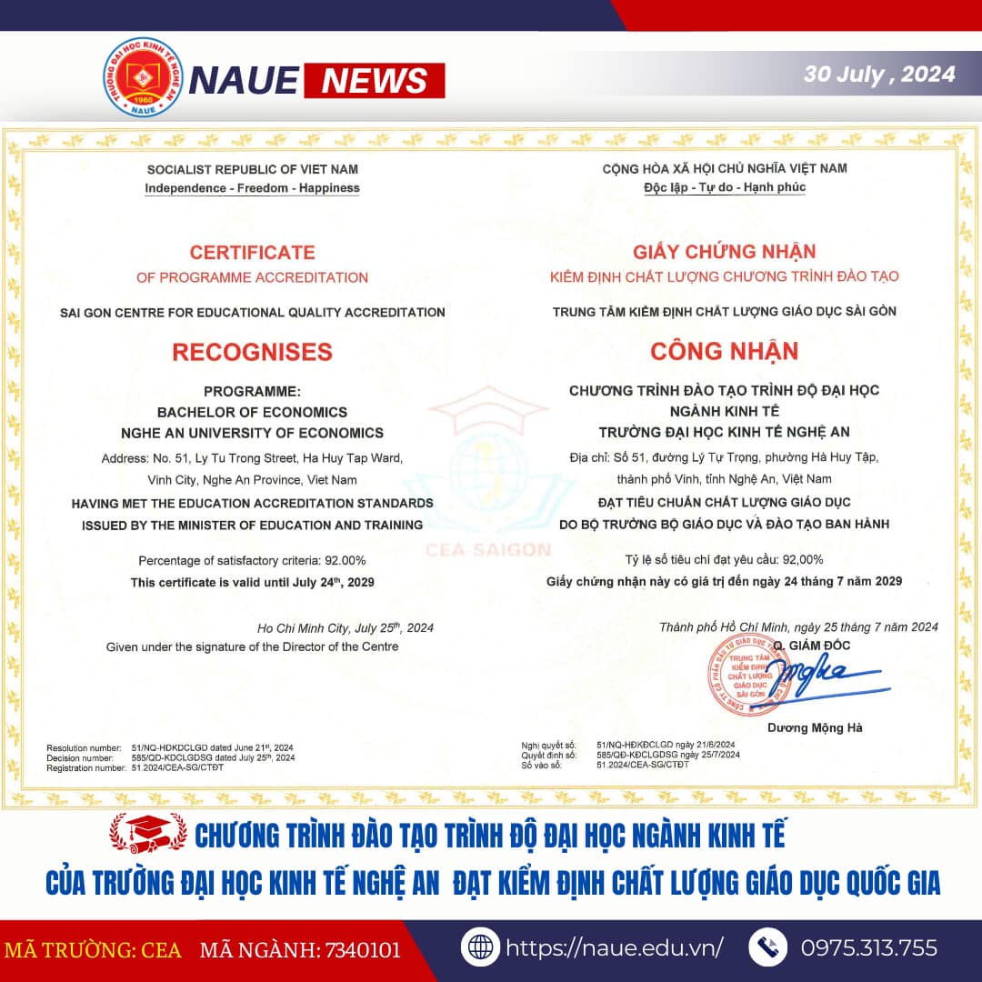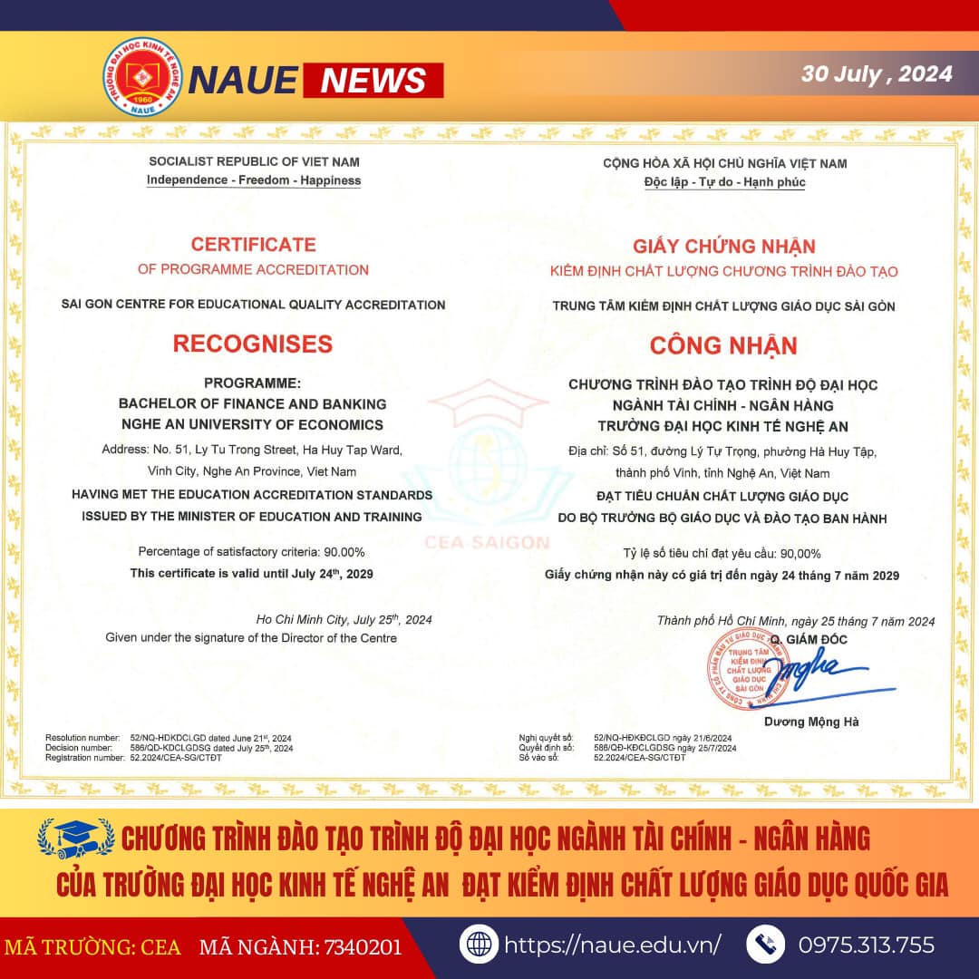Ngày 25/7/2024, Trung tâm kiểm định chất lượng giáo dục Sài Gòn đã ban hành quyết định số 585/QĐ-KĐCLGDSG và quyết định số 586/QĐ-KĐCLGDSG về việc Công nhận đạt tiêu chuẩn chất lượng chương trình đào tạo và cấp Giấy chứng nhận kiểm định chất lượng chương trình đào tạo trình độ đại học ngành Tài chính - Ngân hàng và ngành Kinh tế của Trường Đại học Kinh tế Nghệ An.